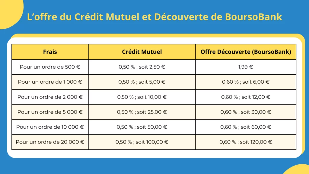 Cependant, dès que tu dépasses les 500 €, les frais passent à 0,60 % par ordre. Cela revient à payer 6 € pour 1 000 €, ce qui est plus cher que les 0,50 % pratiqués par le Crédit Mutuel !